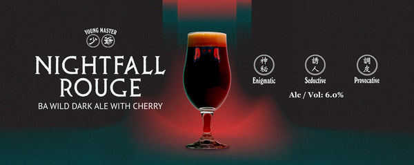 A dusky symphony of funk, fruit, wood and malt, Nightfall Rouge evokes the contemplative mood that sets in as the sun dips below the horizon. It’s a funky and sour dark ale based on Young Master’s solera style “Days of Being Wild” series, fermented with wild yeast and bacteria matured within wine barrels, in a quiet slumber with fresh cherries.